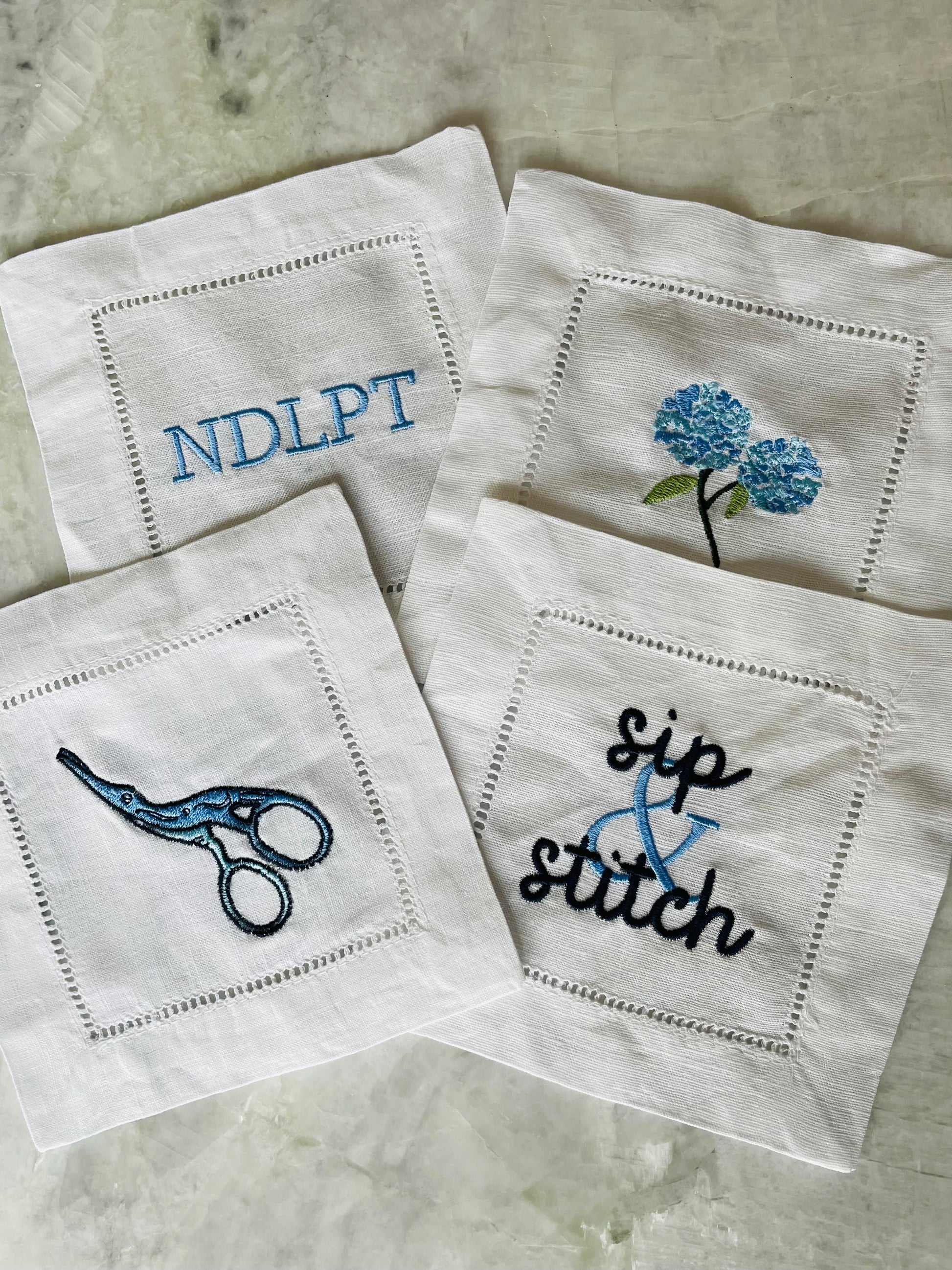 Beautiful Classic Hem Stitched Linen Needlepoint Theme Embroidered Cocktail Napkins. These napkins will be the star of your event. Beautifully embroidered with meticulous care to brighten your surroundings.